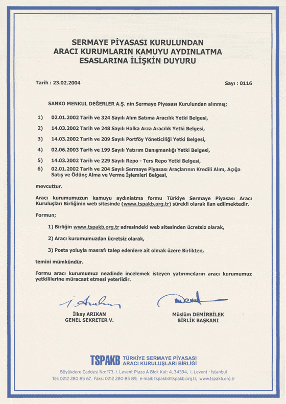 - Sermaye Piyasası Kurulu'ndan Aracı Kurumların Kamuyu Aydınlatma Esaslarına İlişkin Duyuru (23/02/2004) için tıklayınız.
